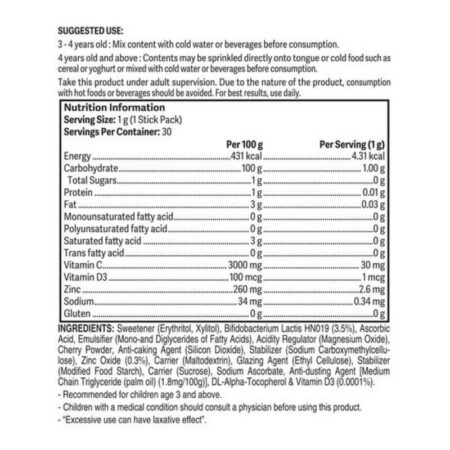 Erythritol, Xylitol, Bifidobacterium Lactis HN019, Ascorbic Acid, Mono-and Diglycerides of Fatty Acids, Magnesium Oxide, Acerola Powder, Silicon Dioxide, Sodium Carboxymethylcellulose, Zinc Oxide, Maltodextrin, Ethyl Cellulose, Modified Food Starch, Sucrose, Sodium Ascorbate, Medium Chain Triglyceride (palm oil) (1.8mg/100g), DL-Alpha-Tocopherol & Vitamin D3.