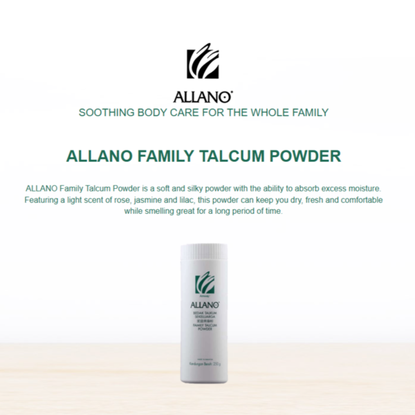 ALLANOĀ FamilyĀ TalcumĀ PowderĀ isĀ aĀ softĀ andĀ silkyĀ powderĀ withĀ theĀ abilityĀ toĀ absorbĀ excessĀ moisture.Ā FeaturingĀ aĀ lightĀ scentĀ ofĀ rose,Ā jasmineĀ andĀ lilac,Ā thisĀ powderĀ canĀ keepĀ youĀ dry,Ā freshĀ andĀ comfortableĀ whileĀ smellingĀ greatĀ forĀ aĀ longĀ periodĀ ofĀ time.