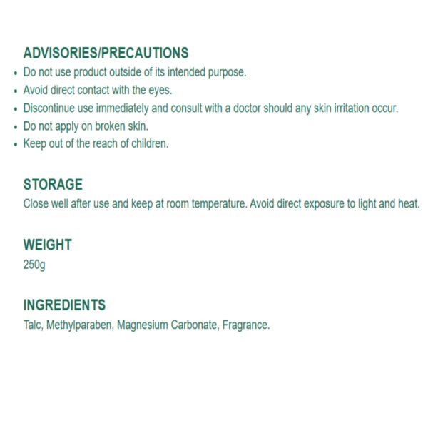 Talc,Ā Methylparaben,Ā MagnesiumĀ Carbonate,Ā Fragrance.