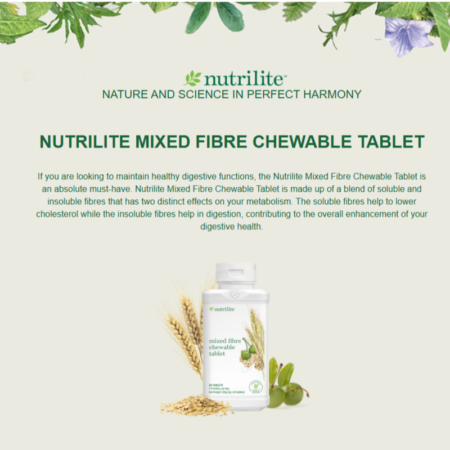 NUTRILITE MIXED FIBRE CHEWABLE TABLETIf you are looking to maintain healthy digestive functions, the Nutrilite Mixed Fibre Chewable Tablet is an absolute must-have. Nutrilite Mixed Fibre Chewable Tablet is made up of a blend of soluble and insoluble fibres that has two distinct effects on your metabolism. The soluble fibres help to lower cholesterol while the insoluble fibres help in digestion, contributing to the overall enhancement of your digestive health.