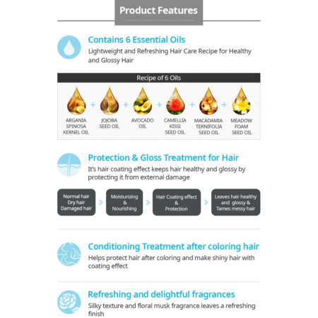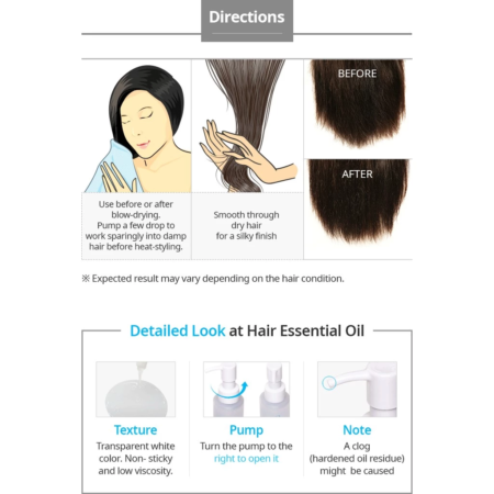 How to use After towel drying, pump out an amount of the content the size of a coin and apply it to damp hair, starting from the ends and tangled areas, like combing. To minimize hair damage from external environment or heat, it is recommended to use before and after drying or before going out.