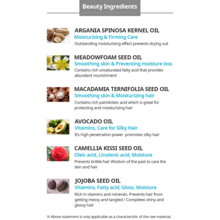 Argania spinosa kernel oil + Jojoba seed oil + Avacado oil + Camellia kissi seed oil + Macadamia ternifolia seed oil + Meadow foam seed oil