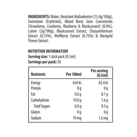 Water, Resistant Maltodextrin (15.0g/100g), Erythritol, Mixed Berry Juice Concentrate (Strawberry, Cranberry, Blueberry, & Blackcurrant), Lutein (12mg/8.5ml), Blackcurrant Extract, Chrysanthemum Extract, Wolfberry Extract & Marigold Flower.