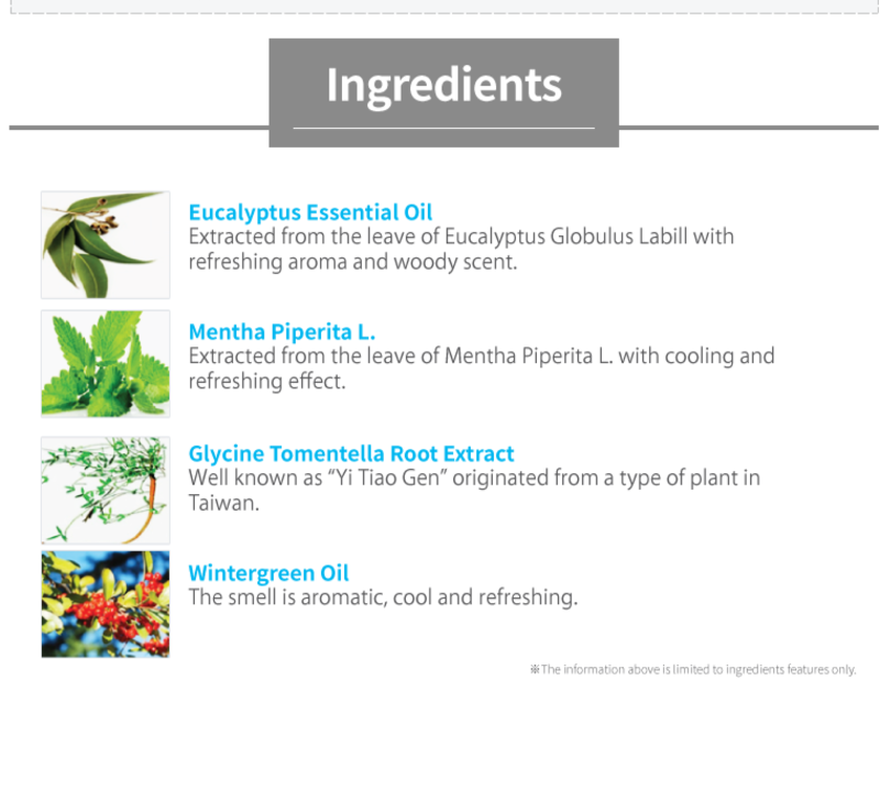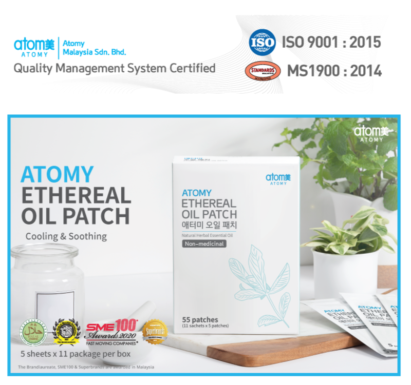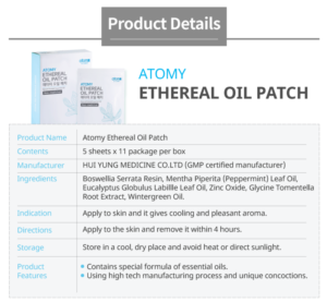 Product Name : Atomy Ethereal Oil PatchContents : 5 sheets x 11 package per boxManufacturer : HUI YUNG MEDICINE CO.LTD (GMP certified manufacturer)Ingredients : Boswellia Serrata Resin, Mentha Piperita (Peppermint) Leaf Oil, Eucalyptus Globulus Labillle Leaf Oil, Zinc Oxide, Glycine Tomentella Root Extract, Wintergreen Oil.