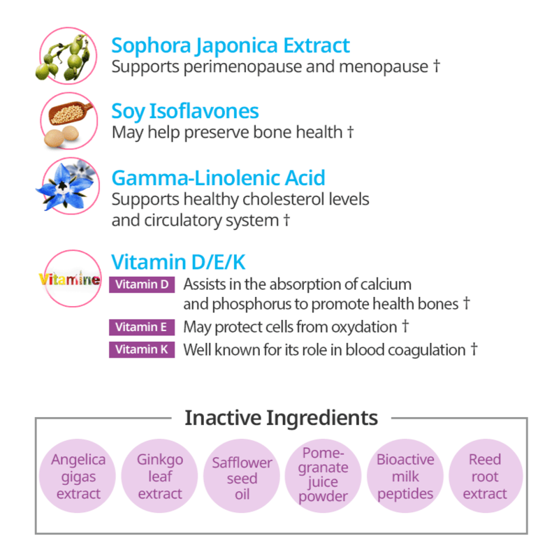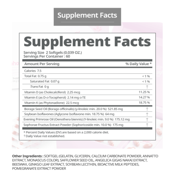 Angelica Sinensis,Cynanchum Bungei Decne,Safflower seed oil,pomegranate,protein hydrolyzate,phragmites and other plant extracts.Also contains Scholartree Fruits extracts,soybean isoflavones,linoleic acid and vitamin D,E,K.