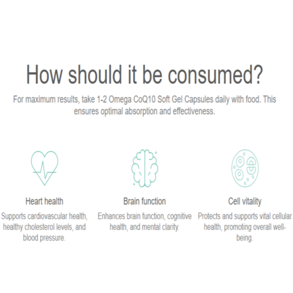 ForĀ maximumĀ results,Ā takeĀ 1-2Ā OmegaĀ CoQ10Ā SoftĀ GelĀ CapsulesĀ dailyĀ withĀ food.
