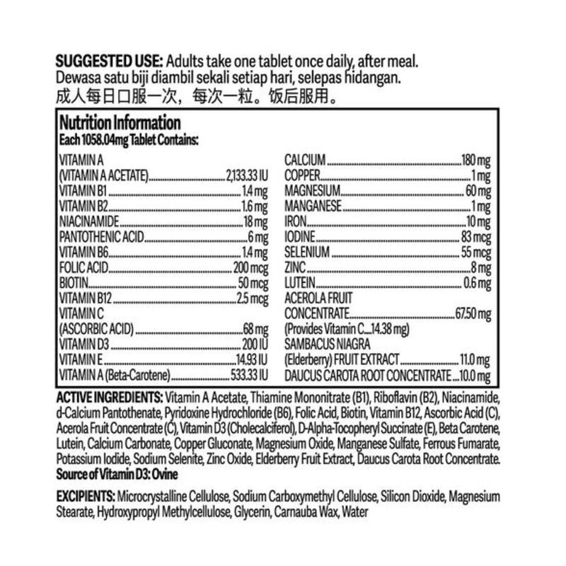 NUTRILITE concentrate, dicalcium phosphate, ascorbic acid (C), ferrous fumarate, d-alpha tocopheryl acid succinate (E), niacinamide, zinc oxide, hydroxypropyl methylcellulose, calcium stearate, copper gluconate, Vitamin A acetate, talc, calcium pantothenate, cellulose gum modified, magnesium oxide, modified food starch, lactose, povidone, riboflavin (B2), glycerin, thiamine mononitrate (B1), pyridoxine hydrochloride (B6), folic acid, potassium iodide, vitamin B12, vitamin D.